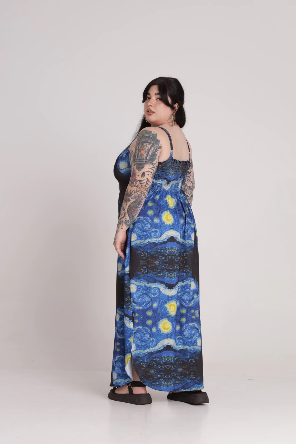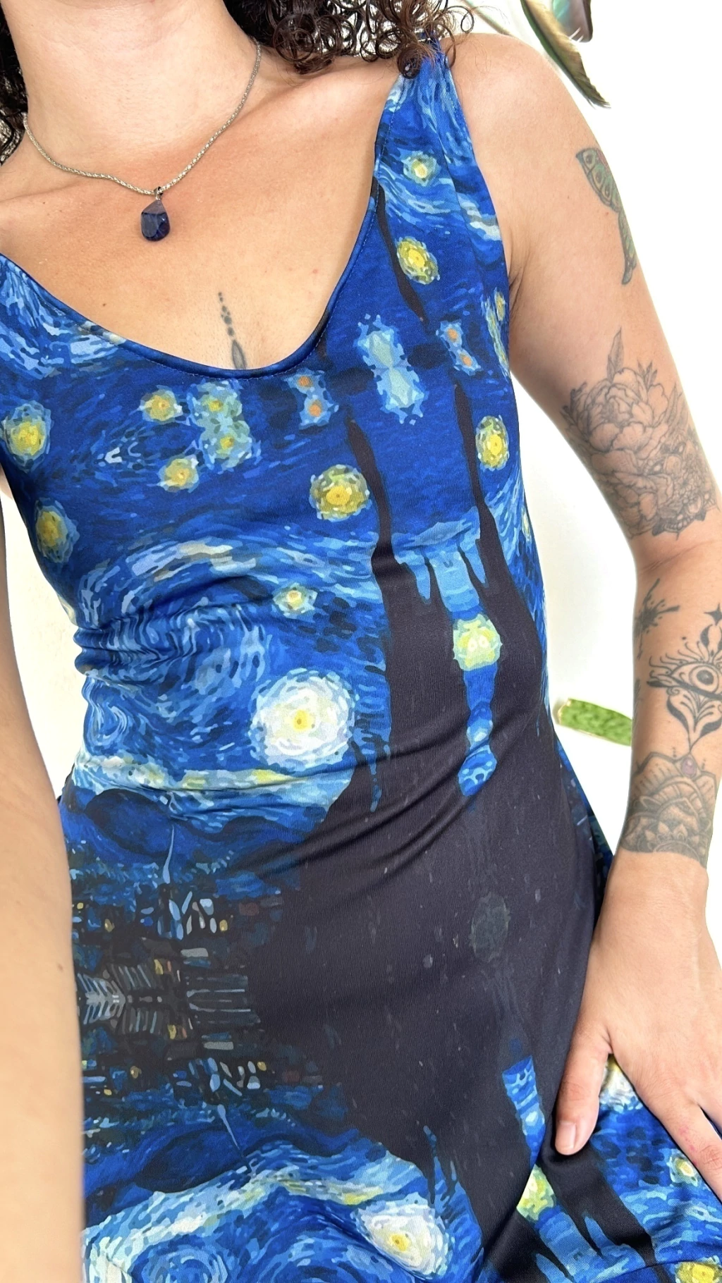 Inspirado na icônica obra de Van Gogh, o Vestido Noite Estrelada é mais do que uma peça de roupa – é uma experiência de vestir arte no corpo. ✨